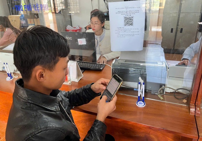 Người dân quét mã QR khảo sát mức độ hài lòng của người dân đối với sự phục vụ của cán bộ, công chức tại bộ phận một cửa xã